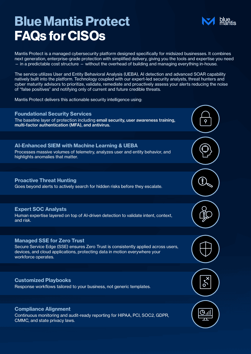 Mantis Protect is a managed cybersecurity platform designed specifically for midsized businesses. It combines next generation, enterprise-grade protection with simplified delivery, giving you the tools and expertise you need — in a predictable cost structure — without the overhead of building and managing everything in-house.